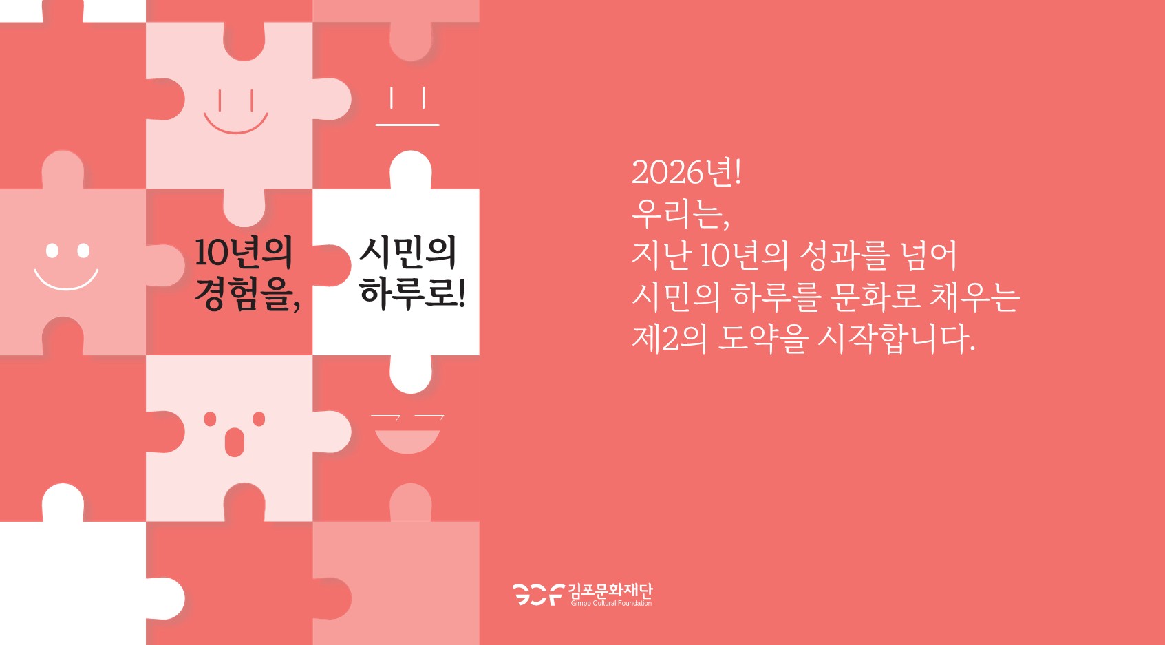 김포문화재단, 「제2의 도약」을 위한 스텝업데이 개최 - 10년의 경험을 바탕으로 시민의 하루를 문화로 채우는 실천적 행정 펼칠 것- □ (재)김포문화재단(대표이사 이계현)은 지난 4일, 직원들이 한마음으로 미래 비전을 공유하는“제2의 도약식: 스텝업 데이(Step-up Day)”를 개최했다고 밝혔다. □ 이번 행사는 직원이 주축이 되어, 지난 10년의 성과를 발판 삼아 향후 10년의 지속 가능한 성장을 위해 함께 나아가야 할 방향을 설정하고 실천 의지를 다지는 자리로 마련되었다. □ 이날 전 직원은“10년의 경험을 시민의 하루로!”라는 슬로건 아래, 시민이 체감할 수 있는 문화예술행정서비스 제공을 약속하는 공동 선언문을 채택했다. 선언문에는 ▲시민과 문화를 잇는 [연결], ▲모두가 누리는 서비스로 시민 곁에 서는 [공감], ▲지속 가능한 콘텐츠로 새로운 가능성을 여는 [융합], ▲ 소통과 존중으로 함께 성장하는 [동행]의 4대 핵심 가치를 담았다. □ 재단은 이번 도약식을 기점으로 내부적으로는 소통과 존중의 조직 문화를 강화하고, 대외적으로는 지속가능한 지역 특화 문화예술콘텐츠 개발을 통해 시민들의 일상 속에 깊이 스며드는 문화 행정을 펼칠 계획이다. □ 전강호 근로자위원장은 개회사에서“오늘 이 자리는 직원들이 주체적으로 재단의 미래를 설계했다는 점에서 매우 뜻깊다”며, “지난 성과를 넘어 시민의 일상 속에 실질적인 변화를 만들어낼 수 있도록, 현장에서 바로 느껴지는 약속들을 실천해 나가겠다”고 밝혔다. □ 재단 관계자는“이번 ‘스텝업 데이’는 재단이 한 단계 더 성장하는 전환점이 될 것”이라며, “앞으로도 시민의 목소리에 귀 기울이며 김포시민의 삶의 질을 높이는 문화예술 전담 기구로서의 역할을 충실히 수행하겠다”고 덧붙였다. |
