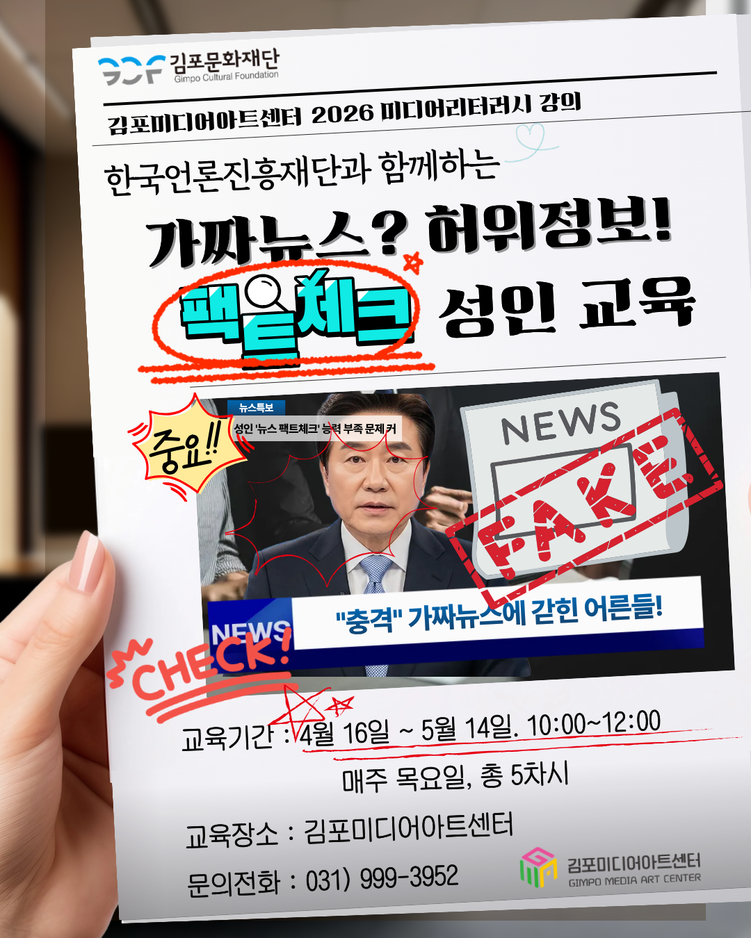 김포 어르신들 '가짜뉴스 거르는 법' 배우세요~ - 김포미디어아트센터-한국언론진흥재단 연계 '팩트체크 미디어 리터러시 교육' 실시- -“가짜뉴스·허위 정보 판별 능력, 시민 대상 심층 교육으로 강화”- (재)김포문화재단은 가짜뉴스와 허위·조작 정보에 대응할 수 있는 시민 역량 강화를 위해 김포미디어아트센터에서 한국언론재단과 협력해 ‘팩트체크 미디어 리터러시 교육’을 상·하반기 각 1회씩, 총 2회 운영한다. 상반기(4~5월)에는 성인을 대상으로, 하반기(8~9월)에는 시니어를 대상으로 맞춤형 교육을 진행하며, 심층적인 커리큘럼을 통해 뉴스와 정보의 진위를 판별하는 능력을 강화한다. 가짜 뉴스와 허위 정보 속에서 뉴스와 정보의 ‘팩트체크’는 이제 필수 역량으로 자리 잡고 있다. 진실을 가려내고 사실에 기반해 소통하는 힘을 기르는 이번 교육은 시민들이 일상에서 올바른 정보 판별 능력을 갖추고 건강한 미디어 환경을 조성하는 데 목적을 두고 있다. 교육 과정은 ▲가짜 뉴스 및 허위·조작 정보의 이해 ▲팩트체크 방법 습득 ▲보이스피싱 예방 ▲개인별 정보 판별 능력 향상 등을 다루며, 참가자들이 실생활 속에서 정보를 올바르게 판별·활용하고 소통할 수 있는 역량을 기를 수 있도록 구성했다. 상반기 성인 대상 ‘팩트체크 교육’은 오는 4월 16일부터 5월 14일까지 매주 목요일 오전 10시부터 12시까지 총 5회차로 진행되며, 참가 신청은 4월 3일부터 4월 15일까지 김포미디어아트센터 홈페이지(www.gcf.or.kr/gmac)를 통해 접수할 수 있다. 김포미디어아트센터 관계자는 “한국언론재단과 협력해 보다 전문적이고 심층적인 교육을 준비했다”며 “성인과 시니어 모두가 미디어 환경 속에서 스스로 정보를 검증할 수 있는 역량을 갖추는 계기가 되길 기대한다”고 밝혔다.