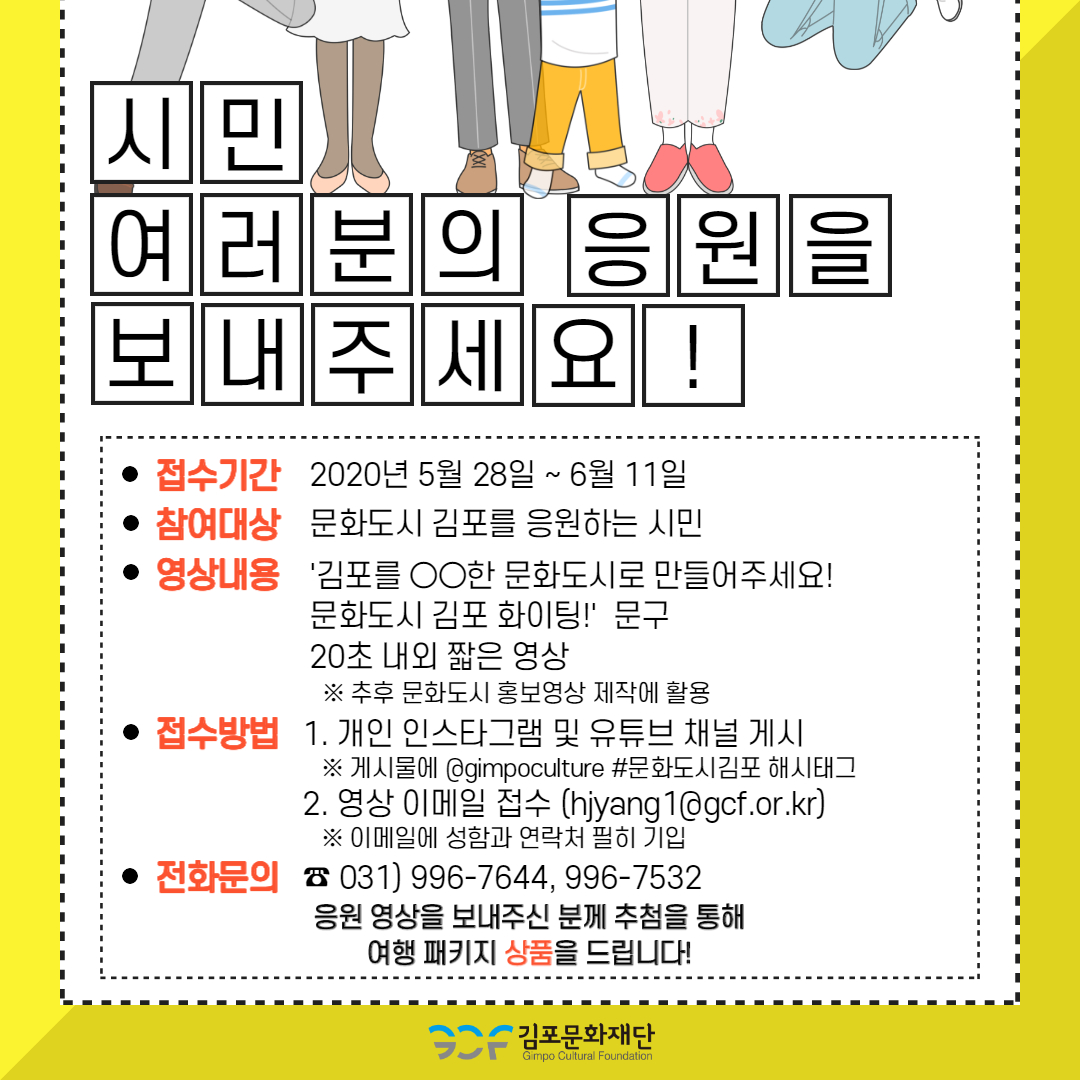 시민 여러분의 많은 참여 바랍니다. 응원 영상을 보내주신 분께 추첨을 통해 여행 패키지 상품을 드립니다 문화도시 시민 응원 챌린지 영상 참고 : 문화도시 김포 페이스북