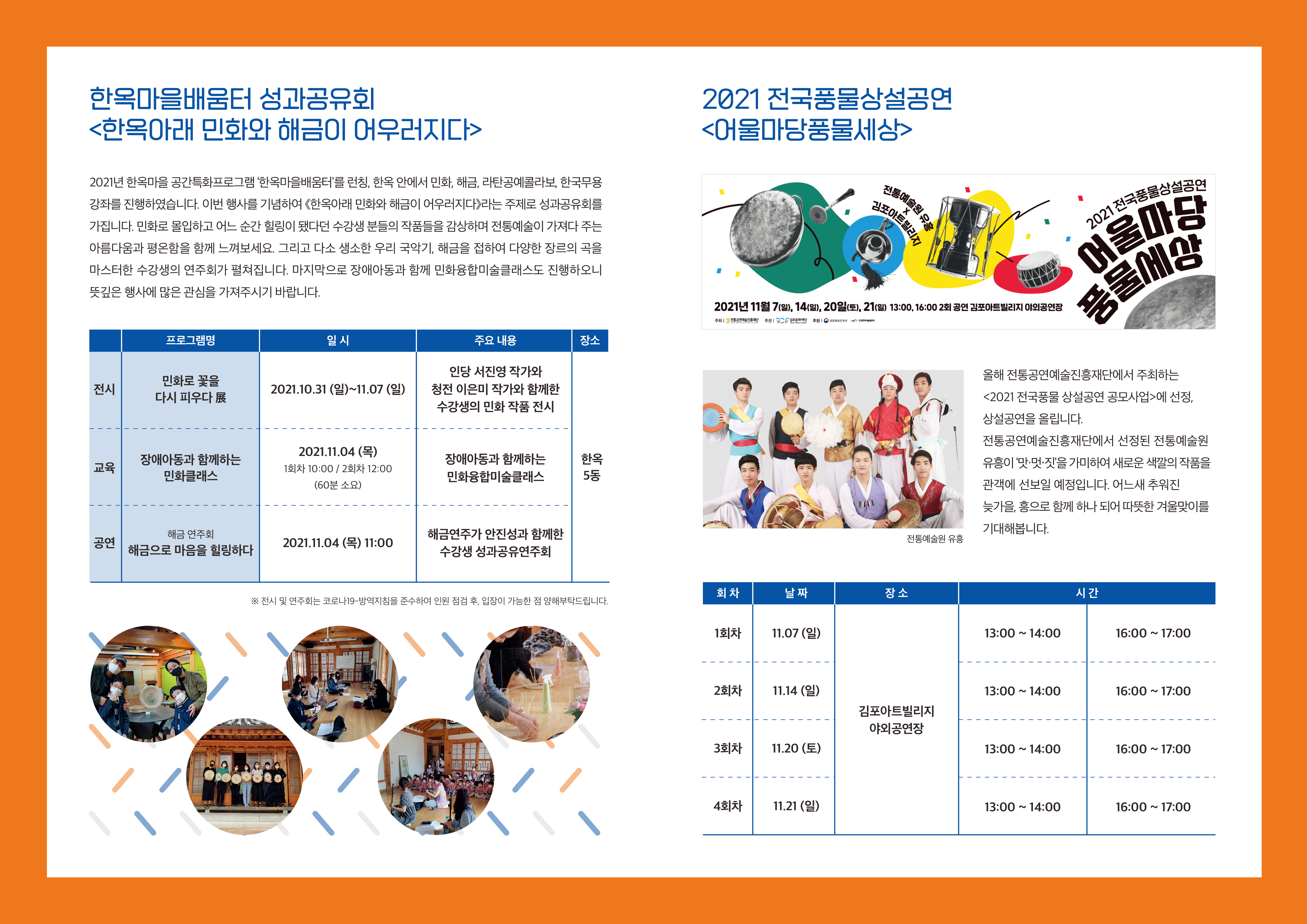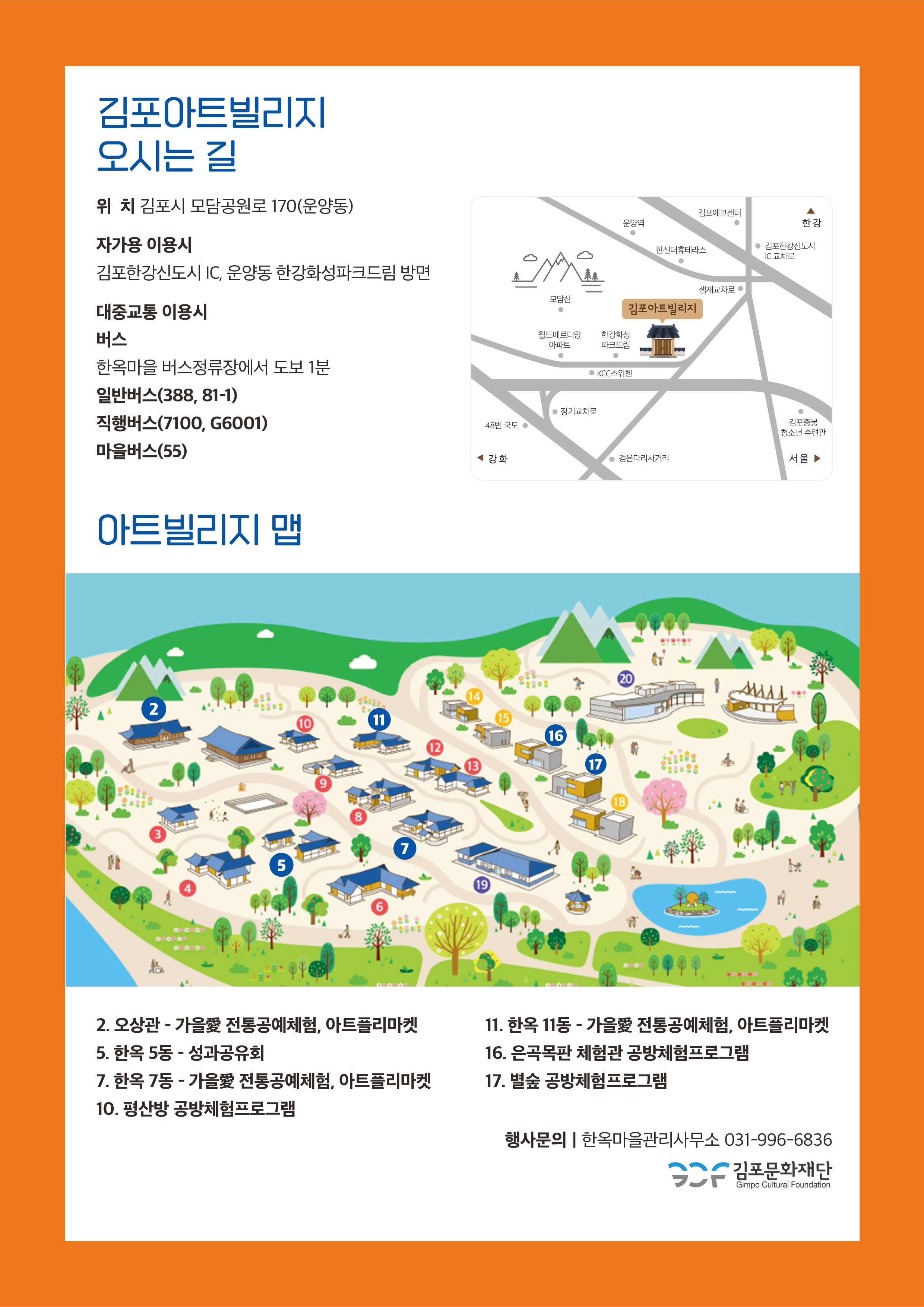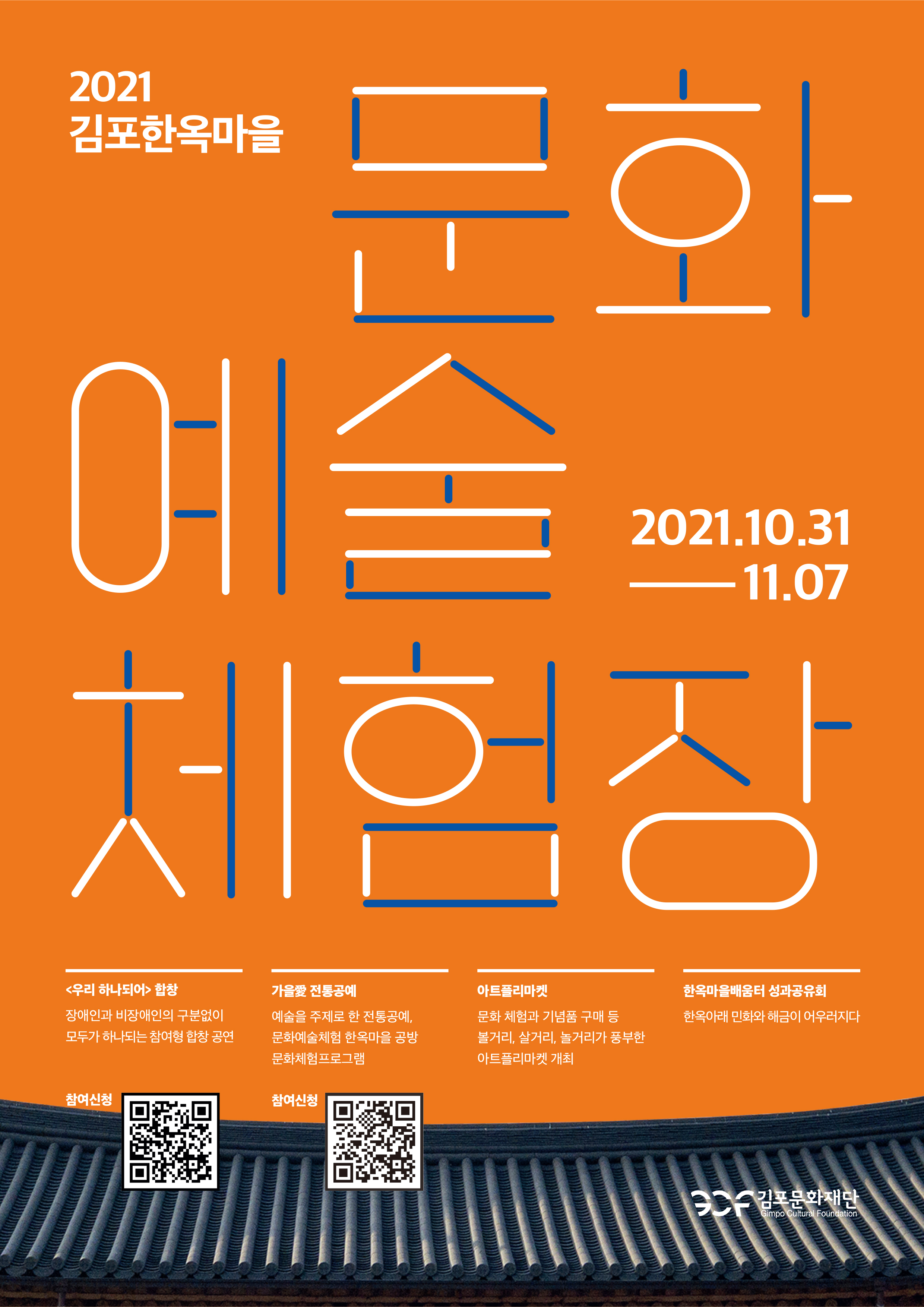 2021 김포한옥마을 문화예술체험장 김포한옥마을 위드코로나 맞이 비대면과 대면을 아우르는 문화예술체험의 장!! 프로그램별 사전참여 신청을 진행하오니 많은 관심과 응원 부탁드립니다! ☆주요행사 참여링크 안내☆ 1. 장애인과 비장애인이 함께하는 100인 줌합창단(비대면 운영) * 모집인원 : 김포에 거주하는 비장애인 50명 * 접수기한 : ~ 2021.10.27 * 참여혜택 : 기념티셔츠 증정 (신청자에 한함) * 신청링크 : http://naver.me/5NdmbkKZ * 김포에 거주하는 장애인의 경우, 전화문의 주시기 바랍니다. ※ 문의처 : 031.996.6836~7 한옥마을팀 2. 한옥아래 문화예술체험과 아트플리마켓 * 모집인원 : 리플렛 참조 (첨부문서 확인) * 신청접수 : https://booking.naver.com/booking/12/bizes/601092 ※ 프로그램별 참가비 별도 발생 3. 공방문화체험프로그램 리플렛 페이지 참조 (첨부문서 확인) 4.(전시연계프로그램) 장애아동과 함께하는 민화융합클래스 * 모집인원 : 장애아동 총 12명(보호자 동반 필수) * 참여장소 : 김포한옥마을 한옥5동 * 접수일 : ~2021.11.02(화) 선착순마감 * 참여시간 : 1회차-10시 2회차-12시 (60분 소요) * 신청접수 : 회차별 네이버폼 신청 - 1회차 접수 : http://naver.me/Fn2uyFwa - 2회차 접수 : http://naver.me/xE10Cp5O ※ 문의처 : 031-996-6845/6837 ![]() ![]() ![]() ![]() ![]() ![]() ※ 상세내용은 첨부파일(리플렛) 확인 |