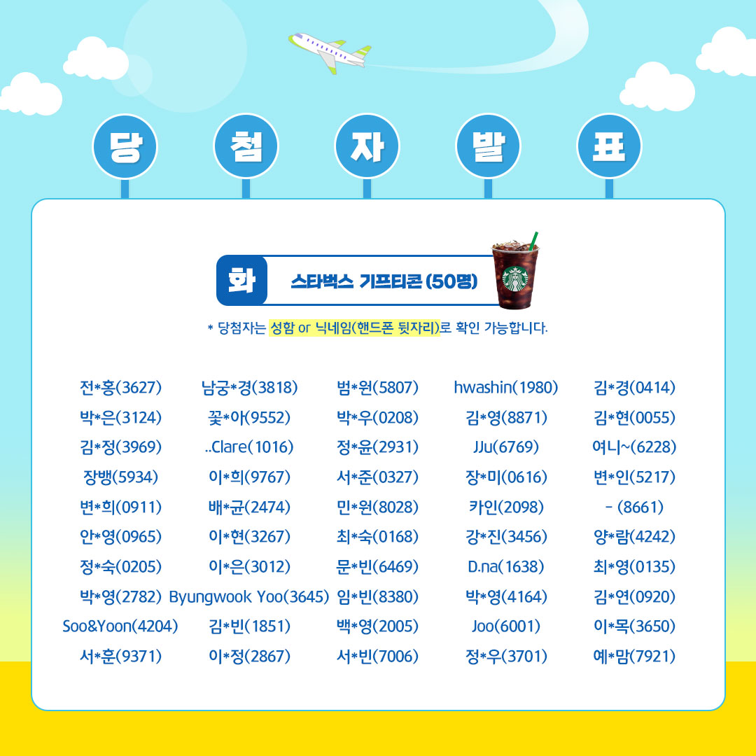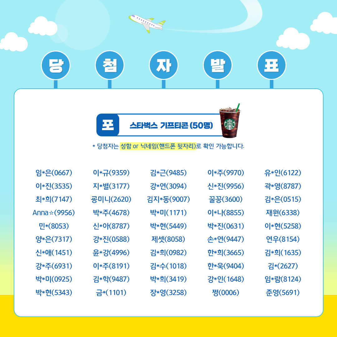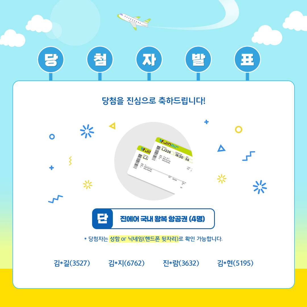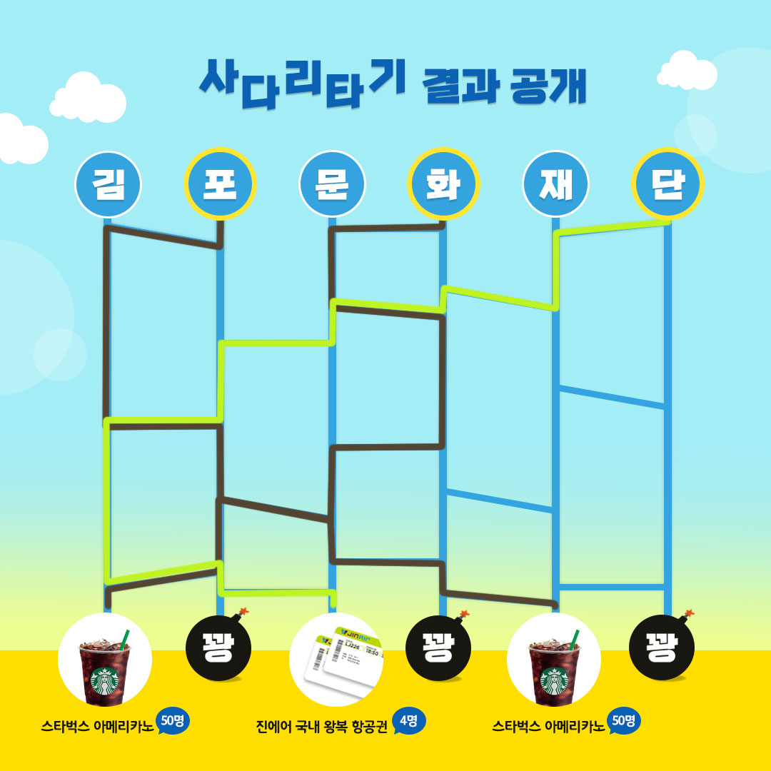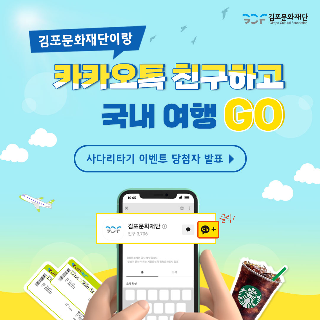 [김포문화재단 이벤트 당첨자발표] 재단이랑 카카오톡 친구하고 국내여행 갈래? 김포문화재단 카카오톡 채널추가 이벤트 당첨자를 발표합니다! 참여해주신 모든 분들께 감사드리며 당첨되신 분들 진심으로 축하드립니다. ![]() ![]() ![]() ![]() ![]() ![]() ■ 경품(추첨) - 진에어 국내 왕복 항공권 4명 - 스타벅스 아메리카노(T) 100명 ■ 경품발송 - 기간 : 2022.05.06 ~ (순차적으로 경품발송) * 진에어 항공권에 당첨되신 분들은 배송 안내를 위해 개별로 연락 드릴 예정입니다. 앞으로도 김포문화재단 카카오톡 채널을 통해 다양한 소식과 정보를 전해드릴 예정이니 많은 관심 부탁드립니다. ![]() [카톡 추가 바로하기]