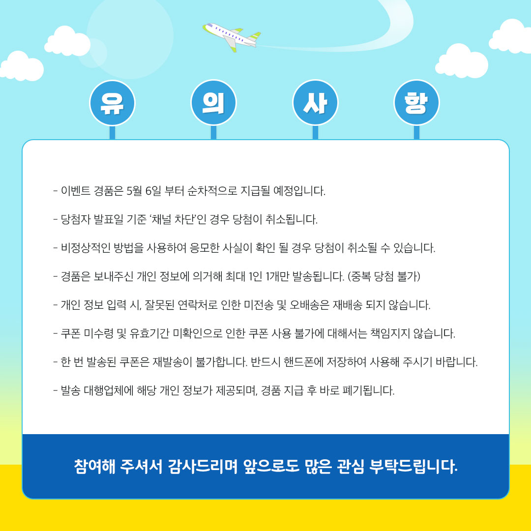 http://pf.kakao.com/_fTEAK ※ 유의사항 - 이벤트 경품은 5월 6일 부터 순차적으로 지급될 예정입니다. - 당첨자 발표일 기준 ‘채널 차단’인 경우 당첨이 취소됩니다. - 비정상적인 방법을 사용하여 응모한 사실이 확인 될 경우 당첨이 취소될 수 있습니다. - 경품은 보내주신 개인 정보에 의거해 최대 1인 1개만 발송됩니다. (중복 당첨 불가) - 개인 정보 입력 시, 잘못된 연락처로 인한 미전송 및 오배송은 재배송 되지 않습니다. - 쿠폰 미수령 및 유효기간 미확인으로 인한 쿠폰 사용 불가에 대해서는 책임지지 않습니다. - 한 번 발송된 쿠폰은 재발송이 불가합니다. 반드시 핸드폰에 저장하여 사용해 주시기 바랍니다. - 발송 대행업체에 해당 개인 정보가 제공되며, 경품 지급 후 바로 폐기됩니다. |