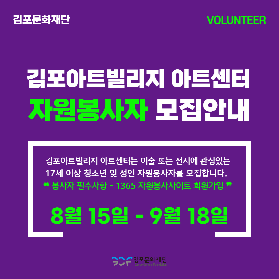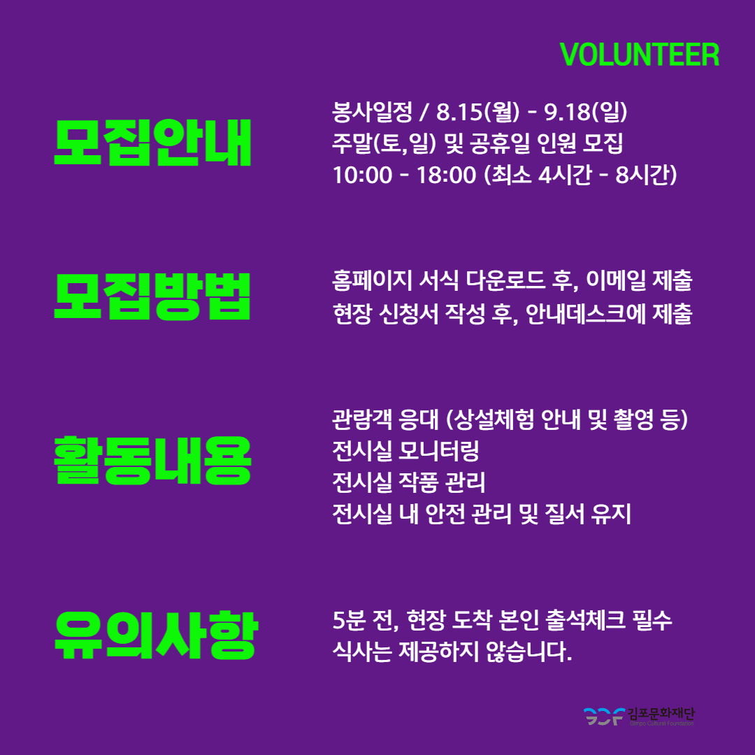 ○ 모집인원 : 2명 ※ 17세 이상 청소년 및 성인이며, 희망시간대 검토하여 1일 최대 4명 배치될 수 있습니다. ○ 모집기간 : 상시모집 ○ 봉사일정 : 2022. 8월 15일 ~ 9월 18일 / 10:00~18:00(최소 4시간 ~ 8시간), 주말 및 공휴일 ※ 자세한 봉사활동 일정은 신청서 하단에 안내드리오니 희망일정에 체크해주세요. ○ 장 소 : 김포아트빌리지 아트센터 2층 전시로비 및 전시실 김포시 모담공원로 170 ○ 교 통 편 : 81-1, 388(한옥마을정류장) / 자차 이용시 주차가능 ○ 신청방법 - 홈페이지 내 신청서식 다운로드 및 작성하여 이메일 제출(jhlee@gcf.or.kr) ○ 활동내용 - 관람객 응대(상설체험 안내 및 촬영 등) - 전시실 모니터링 - 전시실 작품 관리 - 전시실 내 안전 관리 및 질서 유지 ○ 유의사항 - 시작전, 아트센터 2층 전시실로 집결해주세요.(출석체크) - 식사는 제공하지 않습니다. - 무단 봉사불참 및 봉사참여도가 좋지 않을 경우 봉사활동에 제약이 있을 수 있으니 신중히 신청바랍니다. - 궁금하신 사항은 이메일을 통해 문의 바랍니다. ![]() ![]() |