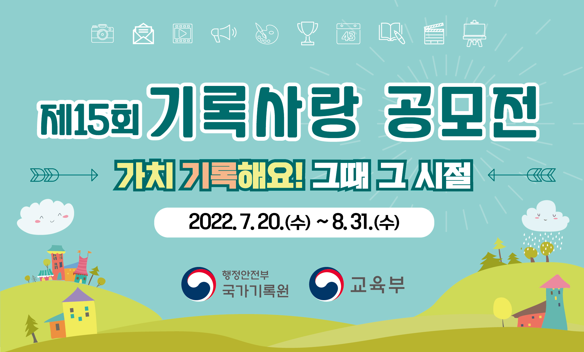 ‘기록’과 관련된 주제로 글짓기‧그림그리기·동영상 제작 ‘기록사랑 공모전’을 7월 20일부터 8월 31일까지 진행합니다. <1. 공모전개요> ◎ 공모명 : 제15회 기록사랑 공모전 ◎ 공모주제 : 3개 주제 중 택 1