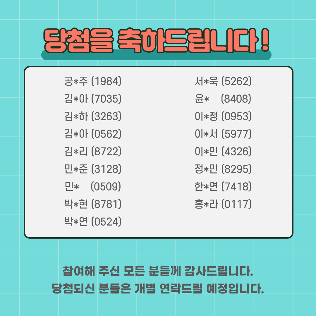 당첨을 축하드립니다. 참여해 주신 모든 분들께 감사드립니다.
