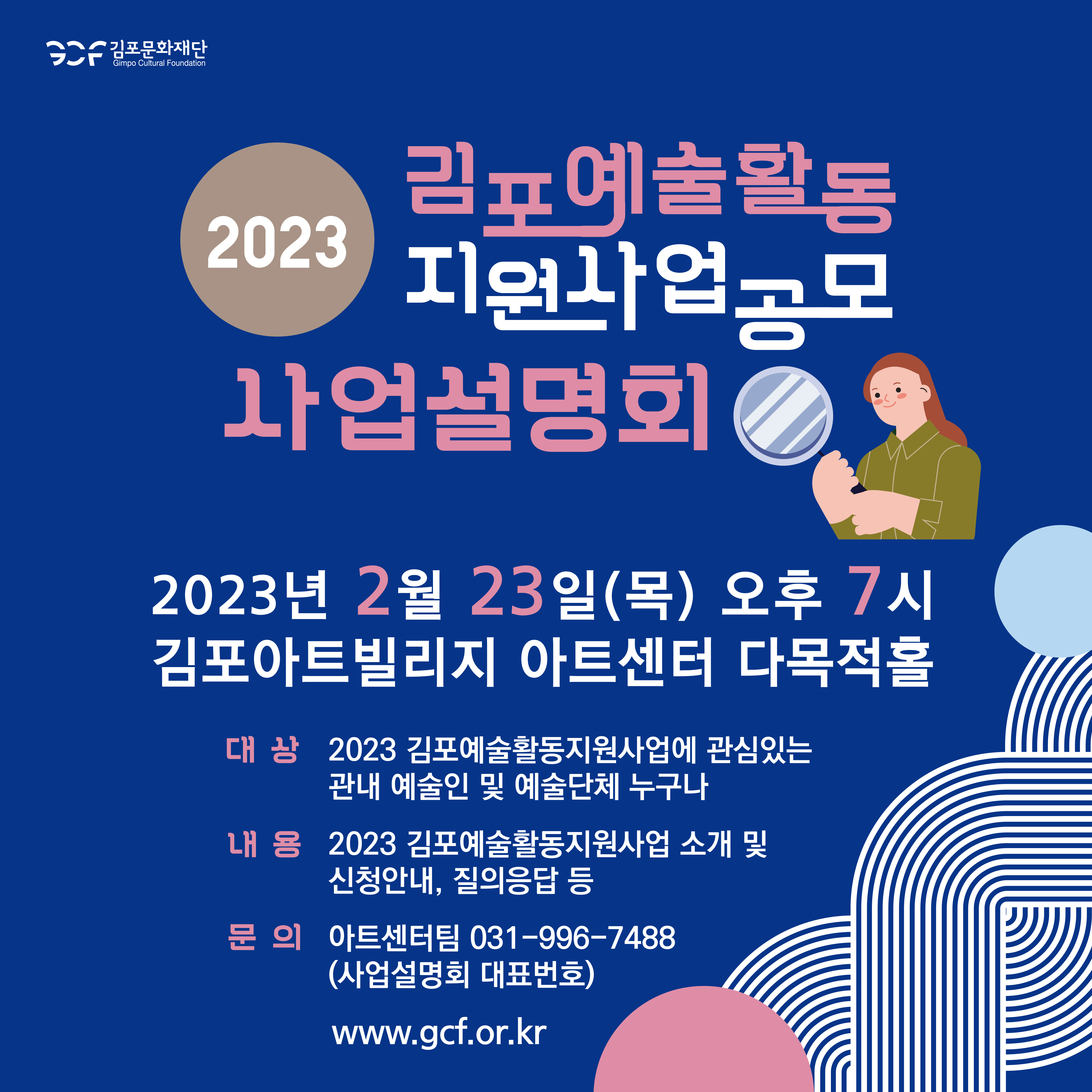 2023 김포예술활동지원사업 사업설명회 안내 김포문화재단에서는 김포에서 활동하는 예술인, 예술단체의 지속적인 활동과 새로운 창작을 지원하기 위해 <2023 김포예술활동지원사업 사업설명회>를 개최 합니다.
