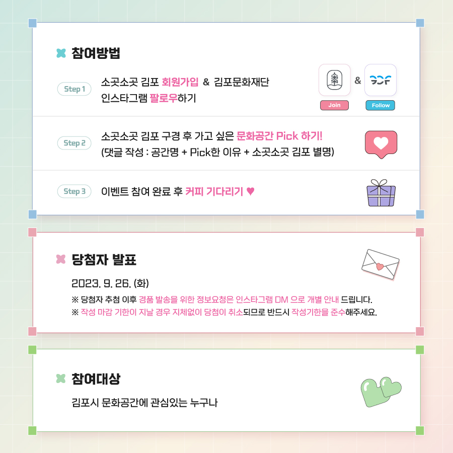 - 재단 인스타그램 팔로우 및 소곳소곳 김포 홈페이지 회원가입 후 참여 가능하며,