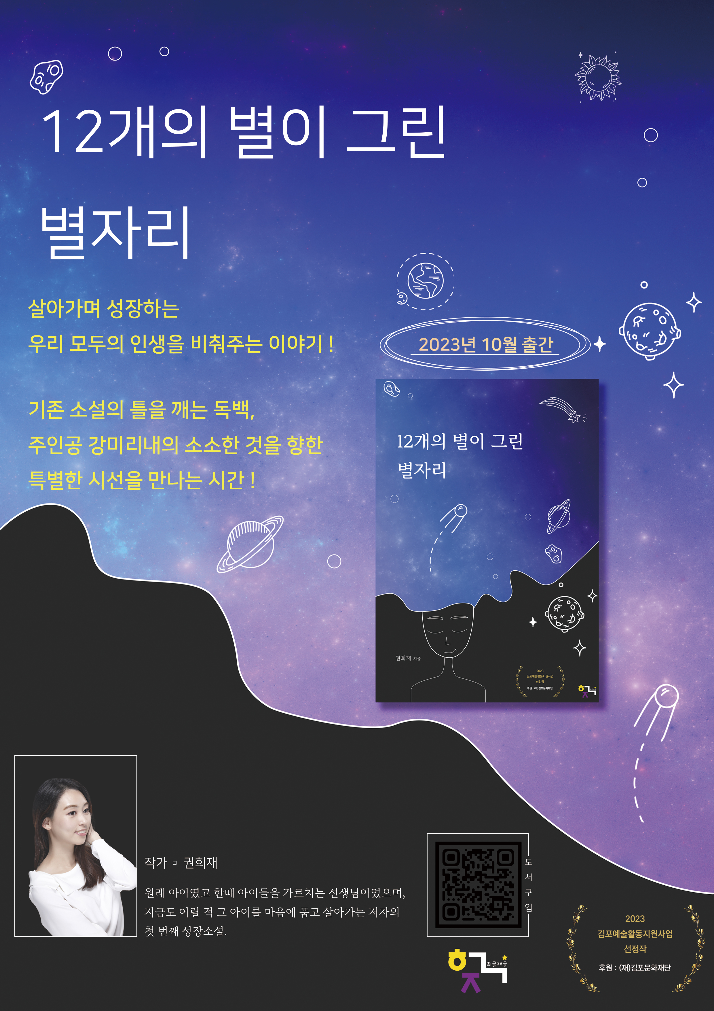 2023년 10월 20일, 권희재 작가의 <12개의 별이 그린 별자리>가 공개됩니다! <12개의 별이 그린 별자리>는 ‘2023년 김포예술활동 지원사업’에 선정된 소설입니다.