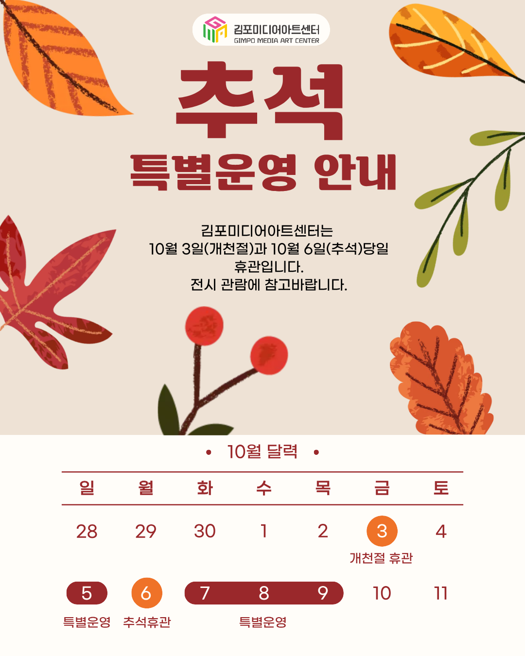 10월 3일(금) 개천절과 10월 6일(월) 추석 당일 센터 휴관을 안내드리오니 전시 관람에 참고 부탁드립니다.