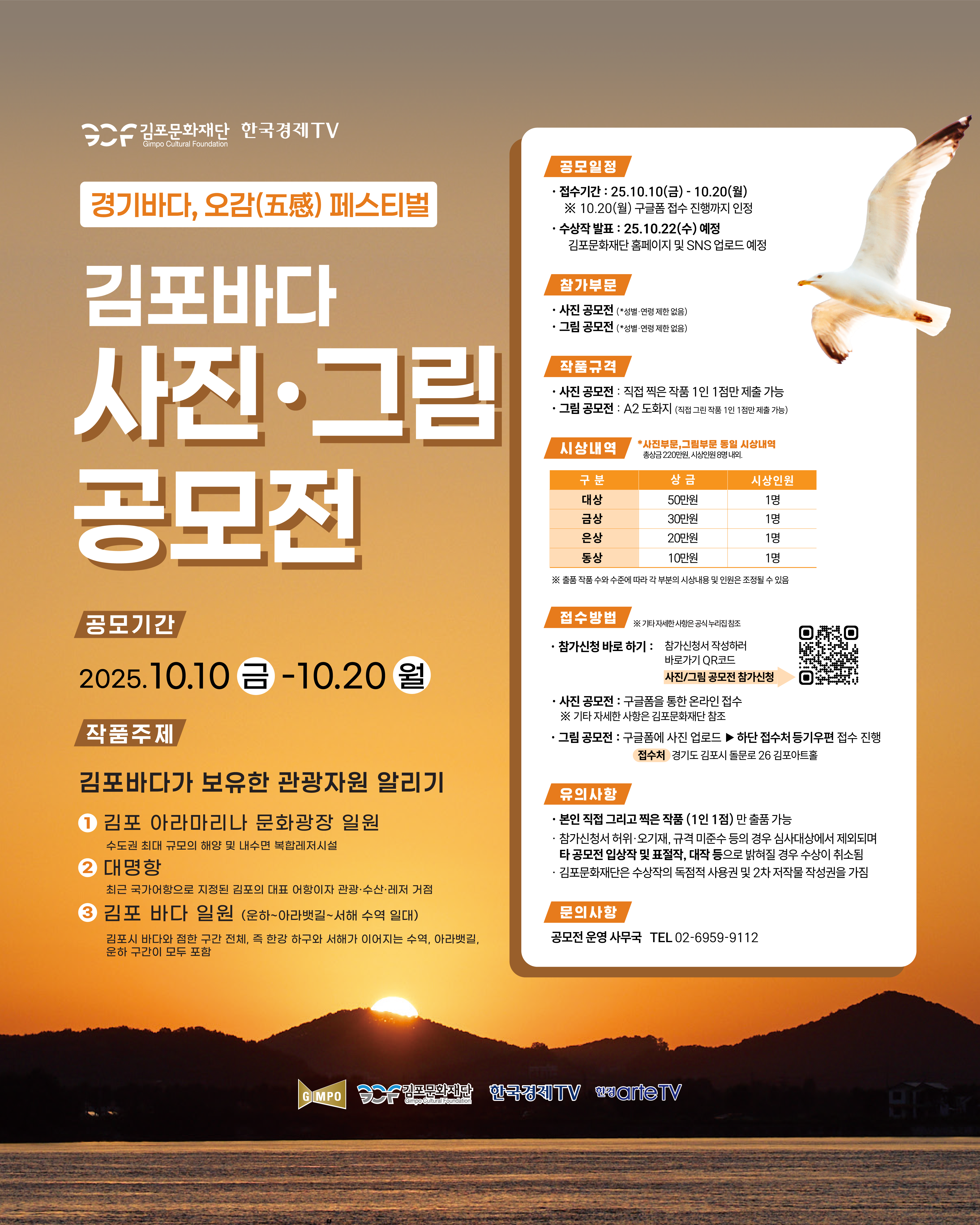 1) 응모 자격 : 연령제한없음, 개인 1인 (전국) 2) 작품 주제 : 김포바다가 보유한 관광자원 알리기 ① 계절 변화, 도시 속 자연 ② 일상 속 김포바다 4) 공모 접수 방법 ① 사진 공모전 : 구글폼을 통한 온라인 접수 / 본인이 직접 찍은 작품 (1인 1점)만 업로드 진행 ② 그림 공모전 : 구글폼에 사진 업로드 후 아래 주소로 등기우편 접수 - 접수처: 경기도 김포시 돌문로 26 김포아트홀 - 접수 기간 내 등기우편 도착에 한해 접수 인정 ▶ 구글폼 바로가기 : https://docs.google.com/forms/d/e/1FAIpQLSeefVUgHH1e5q-rVDHodv_jxm3pW1b_BW0VfZbeqkTBP9B5bw/viewform?pli=1 6) 결과 발표 : 2025.10.22(수) ※공지 및 개별 연락 예정 7) 관련 문의 : 김포바다 사진/그림 공모전 운영사무국 02-6959-9112