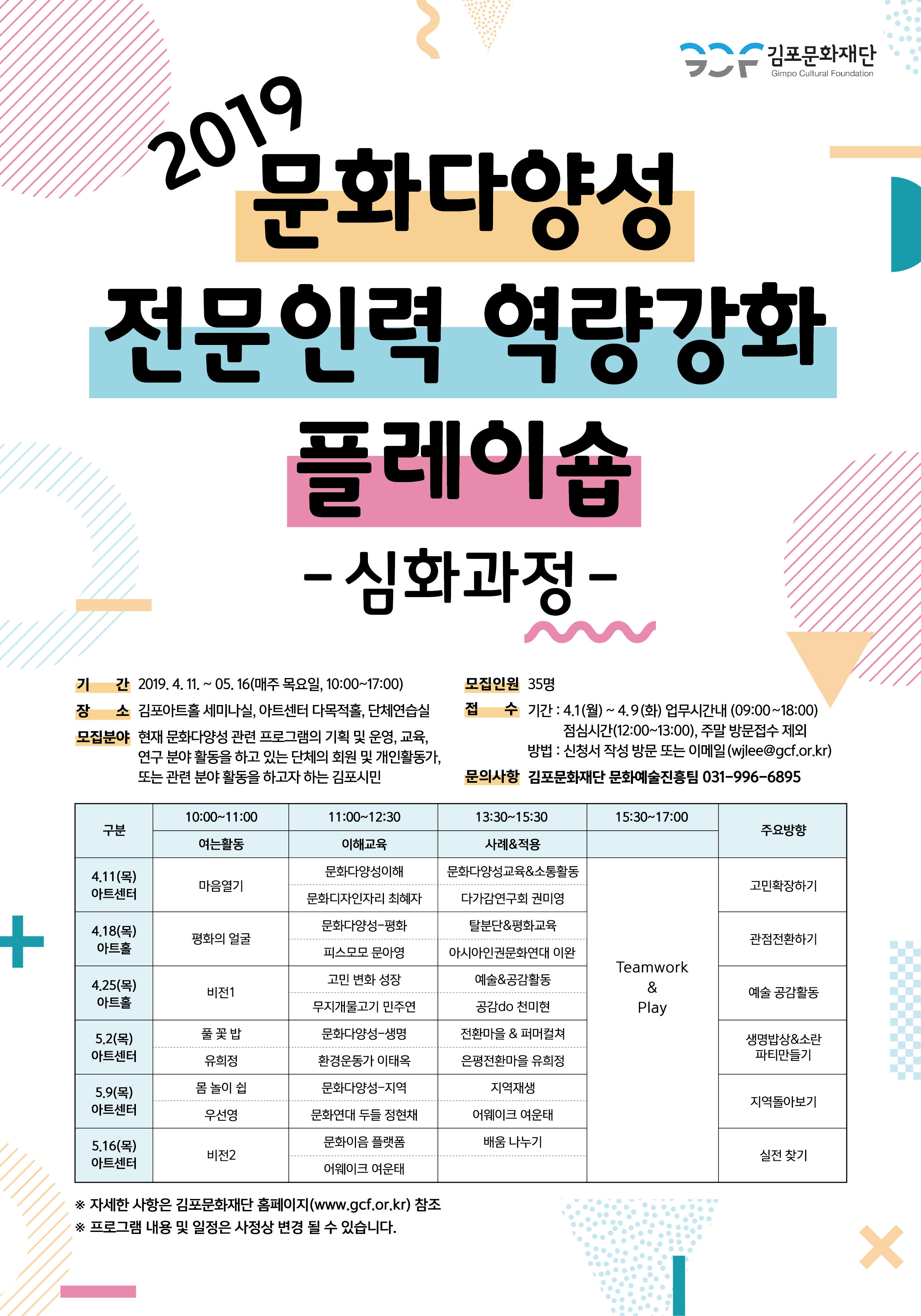 □ 기 간 : 2019. 4. 11. ~ 05. 16(매주 목요일, 10:00~17:00) □ 장 소 : 김포아트홀 세미나실, 아트센터 다목적홀, 단체연습실 □ 모집대상 : 현재 문화다양성 관련 프로그램의 기획 및 운영, 교육, 연구 분야 활동을 하고 있는 단체의 회원 및 개인활동가, 또는 관련 분야 활동을 하고자 하는 김포시민 ※ 교육 기간(총 36시간) 중 30시간 이상 참여 가능하신 분 □ 모집인원 : 35명 ※ 모집인원 초과 시 관련 업무(교육) 경력순으로 선정 □ 수강신청 ○ 기 간 : 4. 1(월)~ 마감시, 업무시간내(09:00~18:00)/점심시간(12:00~13:00), 주말 방문접수 제외 ○ 방 법 : 상단의 신청서를 다운로드 후 신청서 작성 방문 또는 이메일 wjlee@gcf.or.kr □ 수료증 발급 : 교육시간 30시간 이상 이수하신 분 ※ 수료후 다양한 교육활동과 워킹그룹 참여 및 5. 25(토) 문화다양성 주간행사 부스운영 ※ 김포시혁신교육지구사업 강사 참여(예정) □ 문의사항 : 김포문화재단 문화예술진흥팀장 이우정(031-996-6895) ![]() |