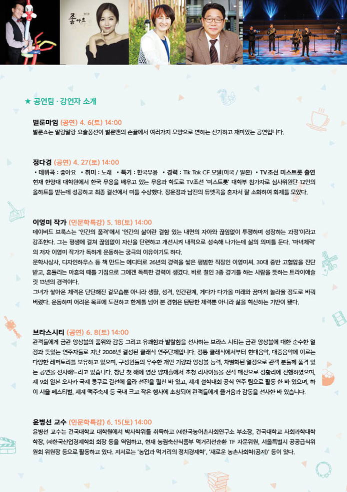 기 간 : 2019. 4. 6.(토) ~ 6. 29.(토) <매주 토요일> 장 소 : 월곶생활문화센터(김포시 월곶면 군하로276번길 20) 내 용 : 문화 공연과 인문학특강, 예술체험 프로그램, 영화상영 참가비 : 무료 문 의 : 김포문화재단 문화예술진흥팀 박성연 주임(031-984-5166) ![]() ![]() |