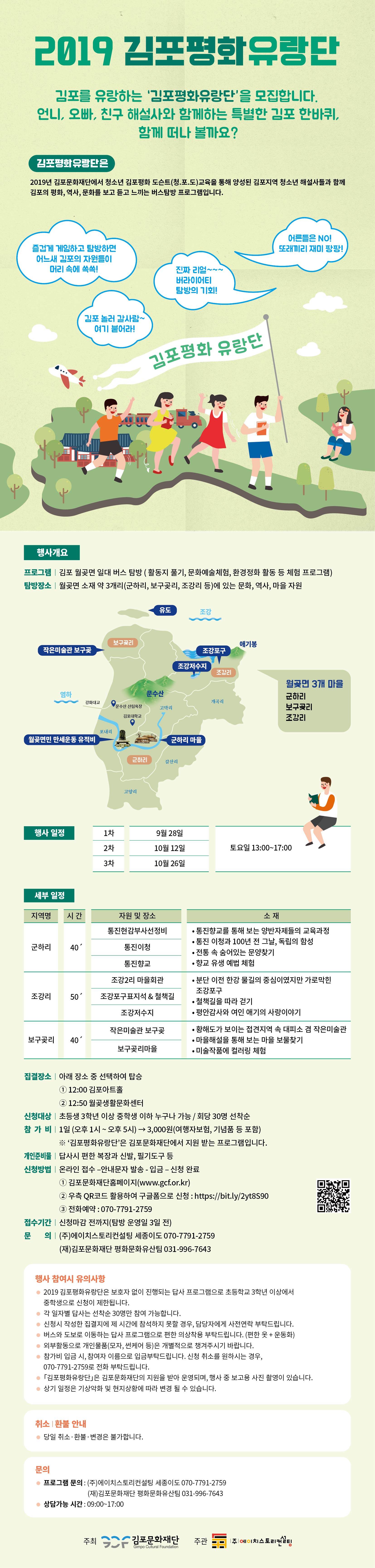 김포문화재단은 청소년 도슨트(청.포.도)교육을 통해 양성된 김포지역 청소년 해설사들과 함께 김포의 평화, 역사, 문화를 보고 듣고 느끼는 버스탐방 프로그램인 김포평화유랑단을 모집합니다. 많은 관심과 참여 부탁드립니다. ※ 신청접수는 >>>> 링크주소로 접수 부탁드립니다. https://bit.ly/2yt8S90 ![]() |