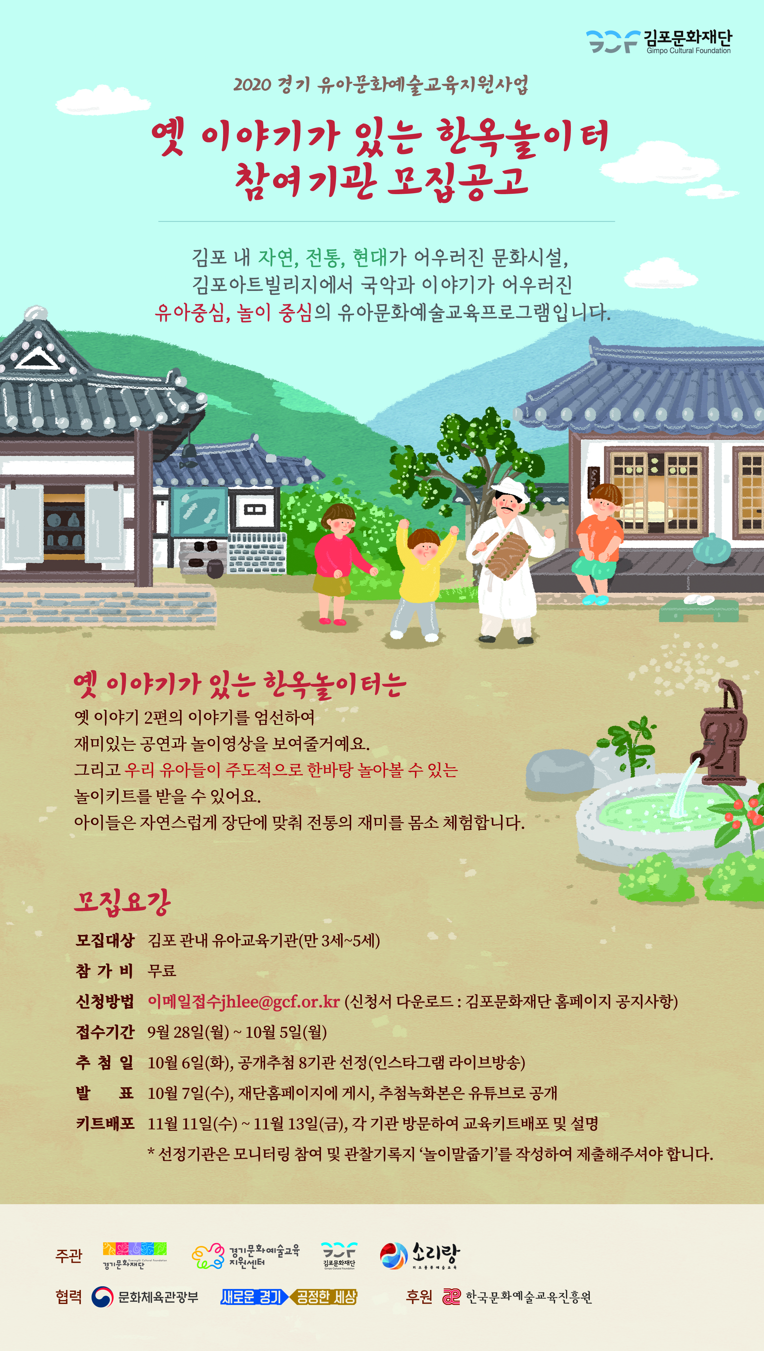 김포문화재단은 2년 연속 선정된 「2020 경기 유아문화예술교육 지원사업」일환으 로 김포 내 자연, 전통, 현대가 어우러진 문화시설, 김포아트빌리지에서 국악과 이 야기가 어우러진 유아 중심, 놀이 중심의 유아문화예술교육프로그램입니다. ‘유아’를 대상으로 하는 문화예술교육인 만큼 코로나19감염을 예방하고자 비대면 교육 방식으로 운영하고자 합니다. 아이들이 너른 한옥마당과 자연에서 함께 하지 못하는 아쉬움을 극복하기 위해 최선을 다할 예정이오니 많은 관심과 참여 부탁드립니다.