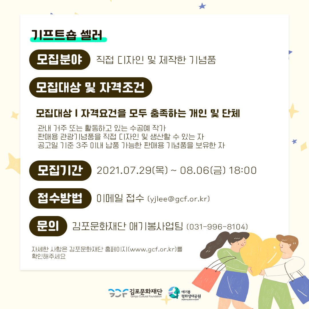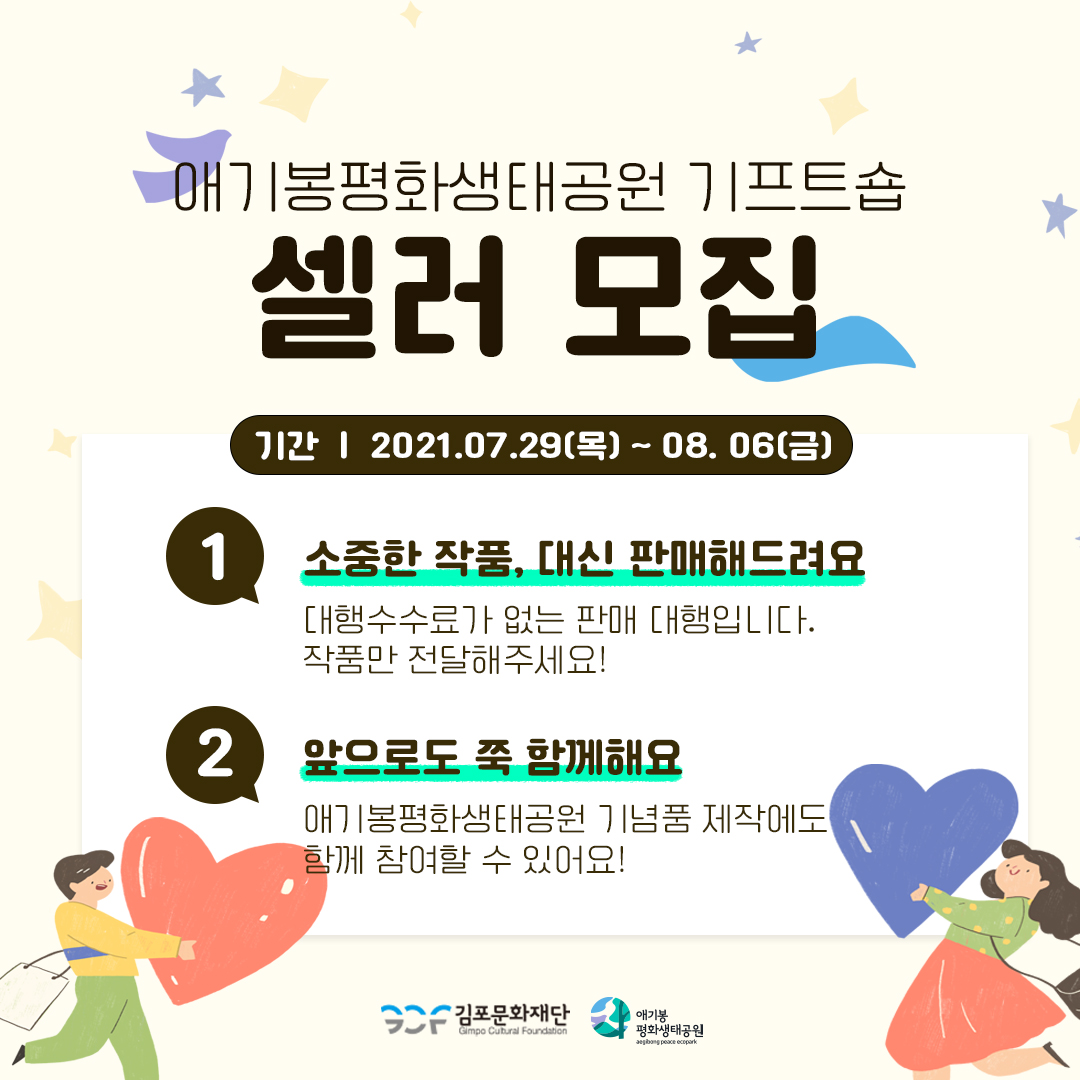 애기봉평화생태공원의 개관에 따라 기프트숍의 원활한 초기 운영과 활성화를 위한 셀러를 모집하고자 합니다. 김포 지역 수공예작가 및 단체의 많은 관심과 참여를 부탁드립니다.
