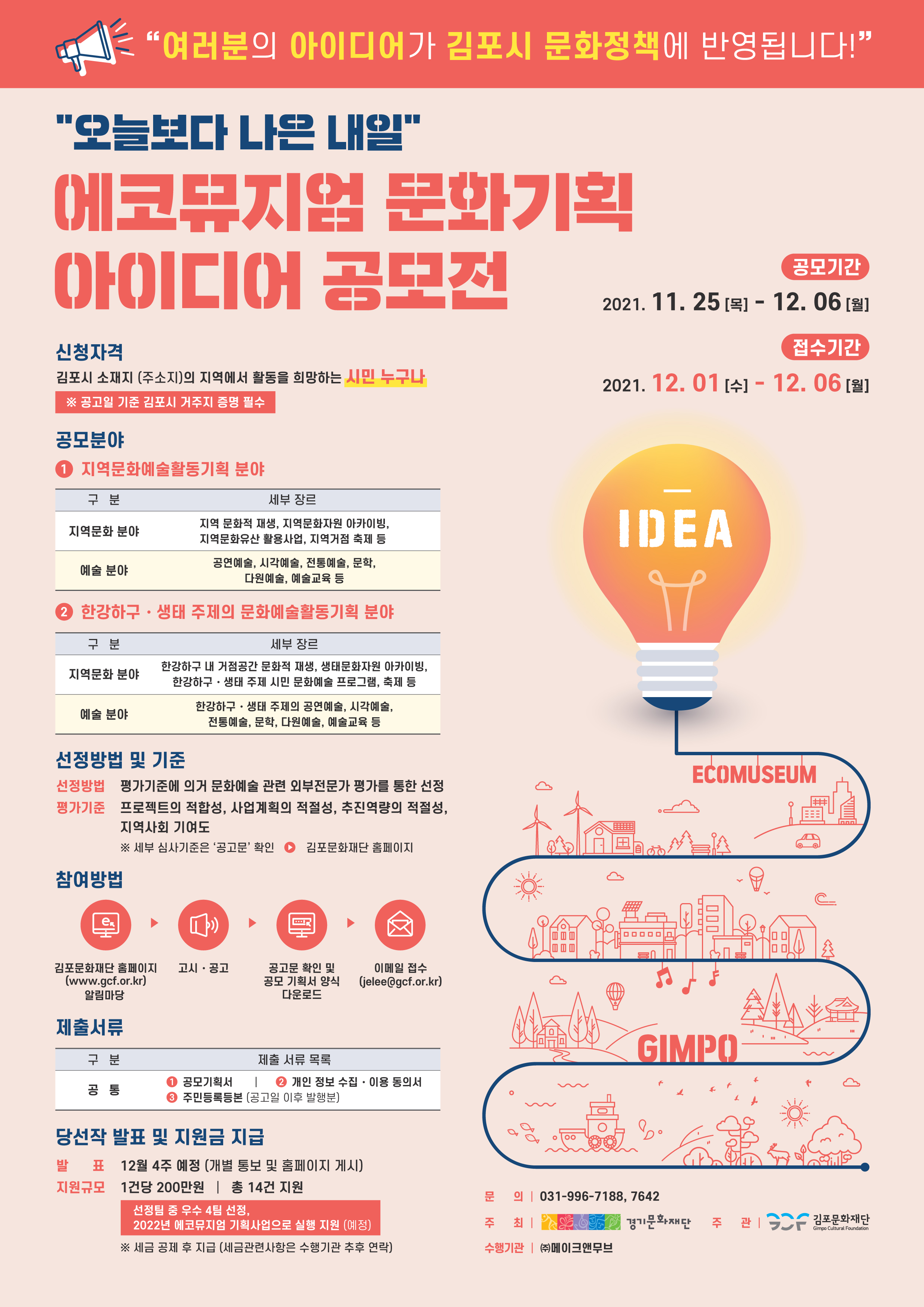에코뮤지엄 문화기획 아이디어 공모전 (재)김포문화재단은 김포시의 사회적 문제를 문화적으로 해결하고 시민들의 아이디어로 지역을 활성화하고 문화적인 도시로 나아가기 위해 ‘에코뮤지엄 문화기획 아이디어 공모전’을 통해 시민들의 문화예술활동을 지원하고자 합니다. 문화로 지역과 함께 활동하시고 싶은 시민 여러분들의 많은 관심과 참여 바랍니다. 2021년 11월 25일