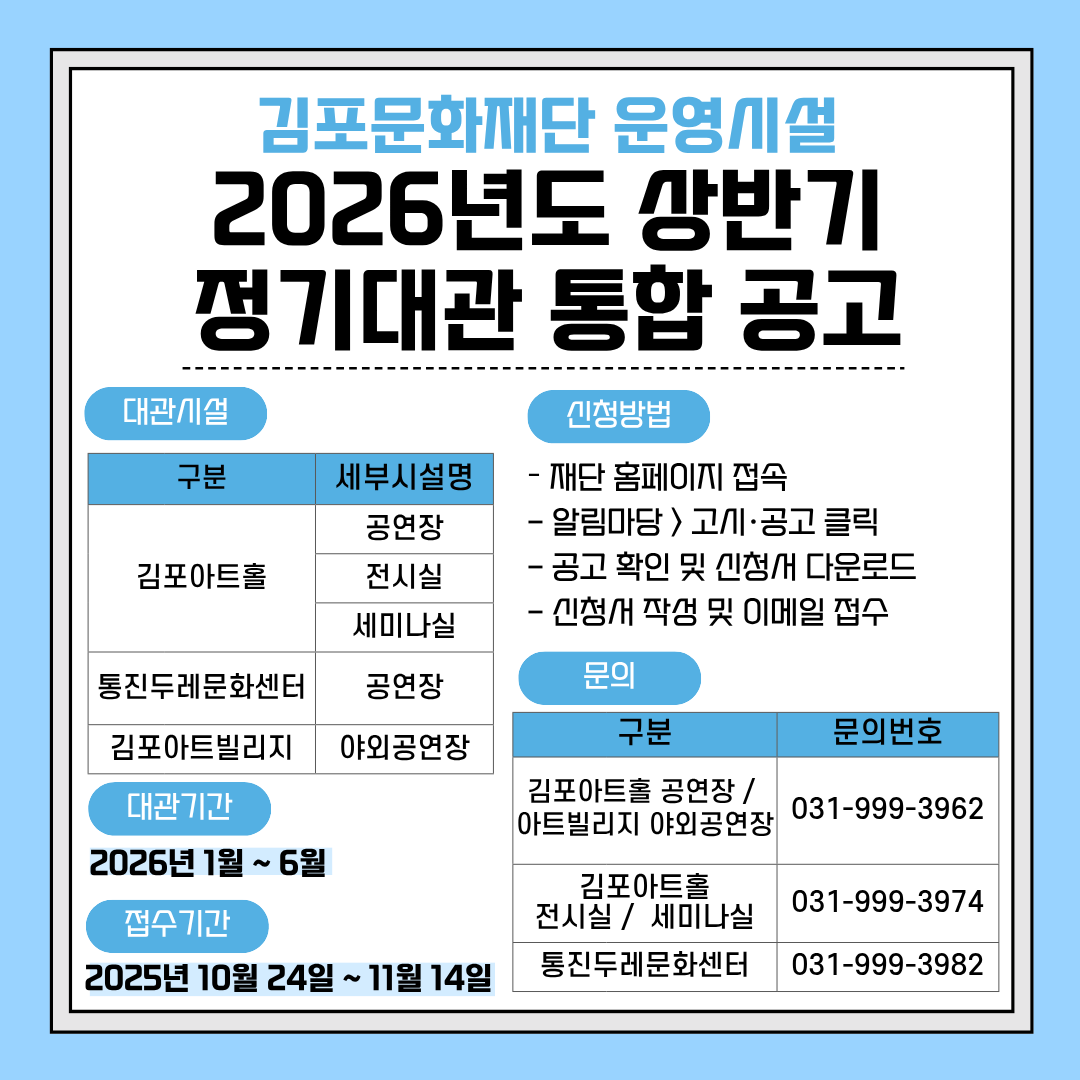 재단법인 김포문화재단은 역량 있는 예술단체 및 예술인들에게 표현 활동의 기회를 제공하고, 시민단체 및 지역 활동가들에게 다양한 활동공간을 지원하고자 다음과 같이 김포문화재단 운영시설 2026년도 상반기 통합 정기대관 신청을 받습니다. 많은 신청을 바랍니다.