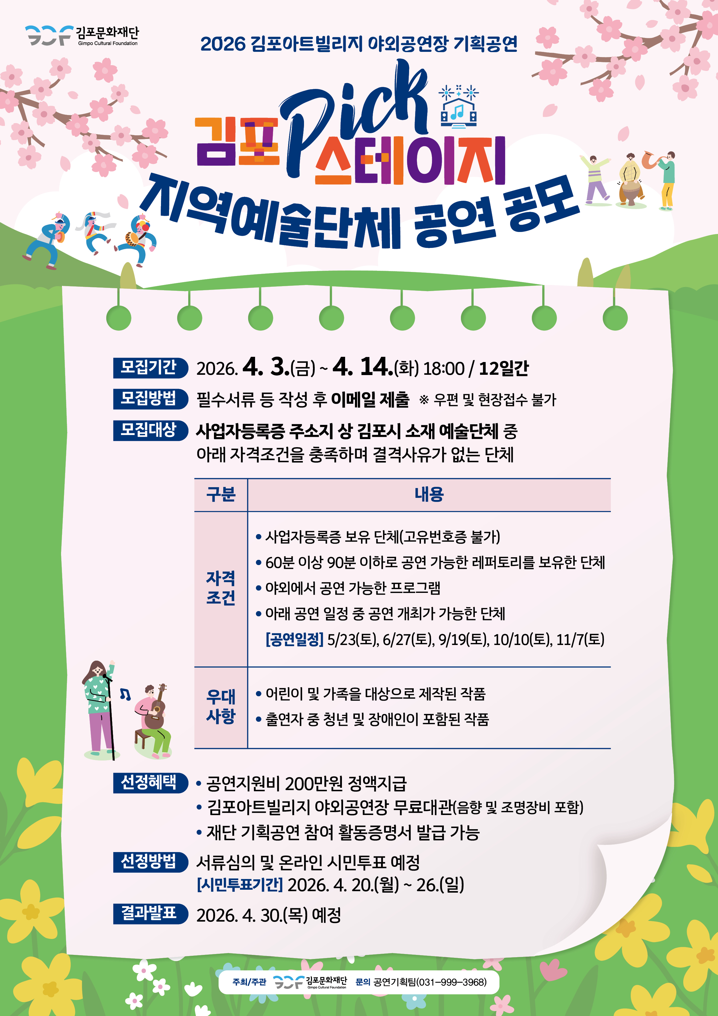 (재)김포문화재단은 지역예술단체의 우수 작품을 발굴하여 시민들에게 소개하고, 관내 예술인 및 예술단체의 재단 기획공연 참여기회 제공을 통해 민관이 상생하는 선순환 체계를 구축 하고자 『2026 김포아트빌리지 야외공연장 기획공연 <김포 PICK 스테이지> 지역예술단체 공연 공모』를 다음과 같이 공고하오니 관내 예술단체의 많은 관심과 지원을 바랍니다.